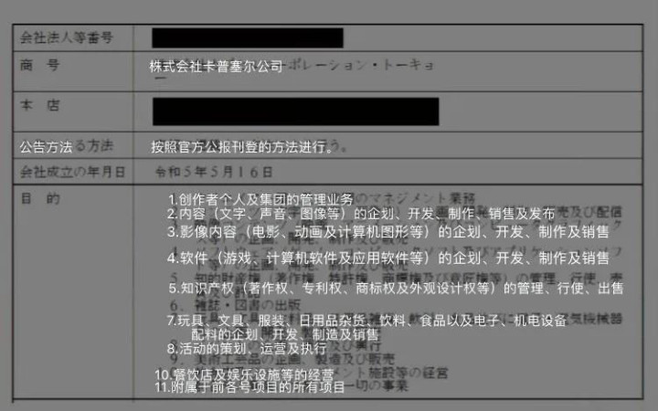 凭证谍报师带来的图片来看,版权之争可能要闭幕了。一家商号名为“胶囊株式会社东京”的公司赢得了最终得手,这家公司不仅拿走了影视和游戏版权,还顺带拿走了餐饮,玩物和服装等临近版权。