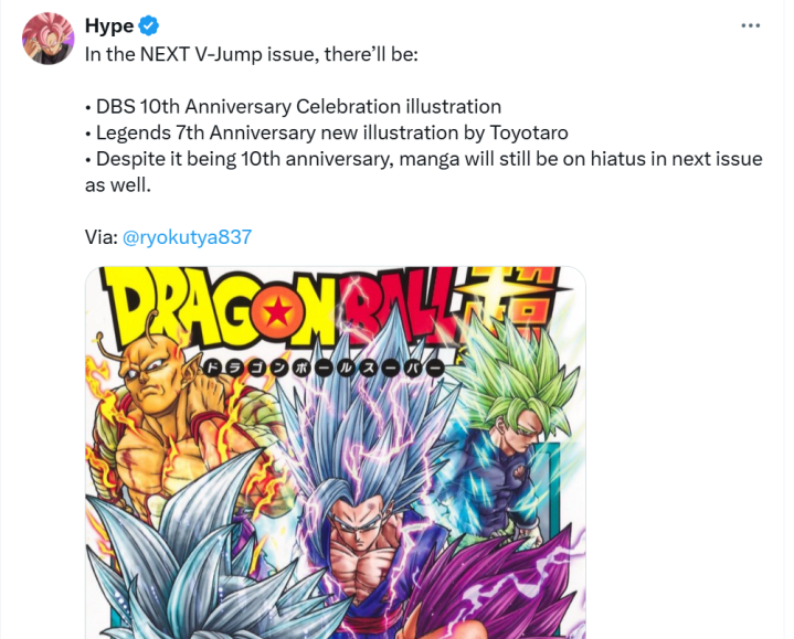 推文马虎如下:下一期V JUMP杂志将会连载《龙珠超》10周年典礼插图;丰太郎为爆裂激战手游绘图的7周年典礼插图;尽管是10周年典礼,可是下个月《龙珠超》漫画依然停刊。