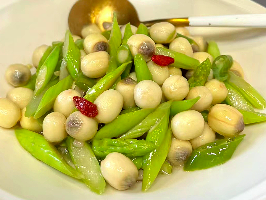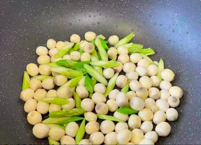4、下入莲子和芦笋一齐翻炒,将食材炒断生即可。(清新的莲子可以径直生吃的)。