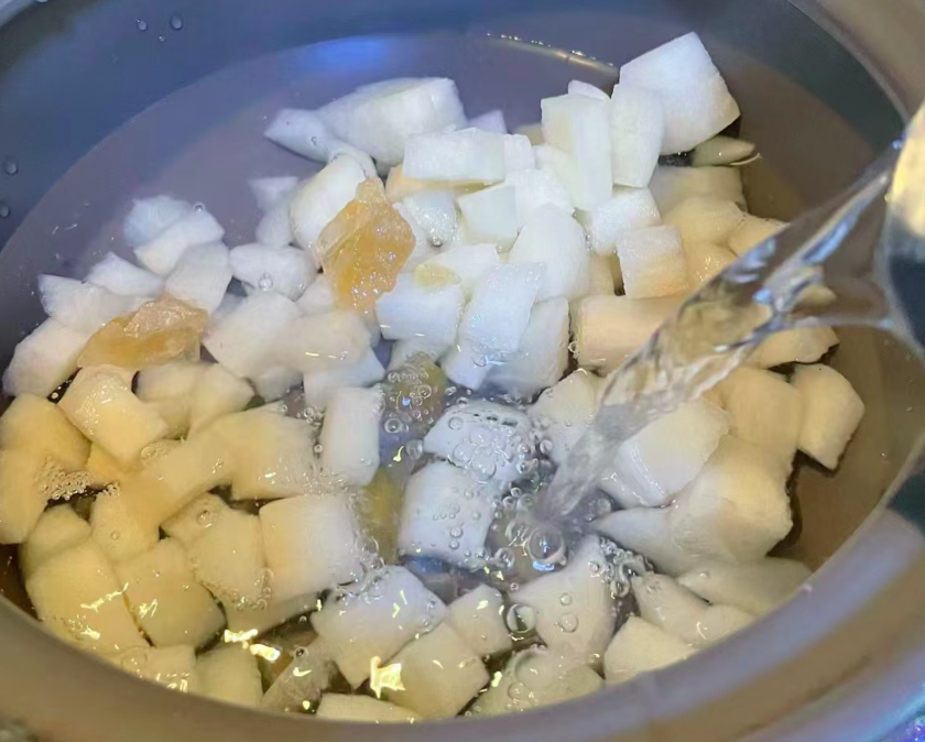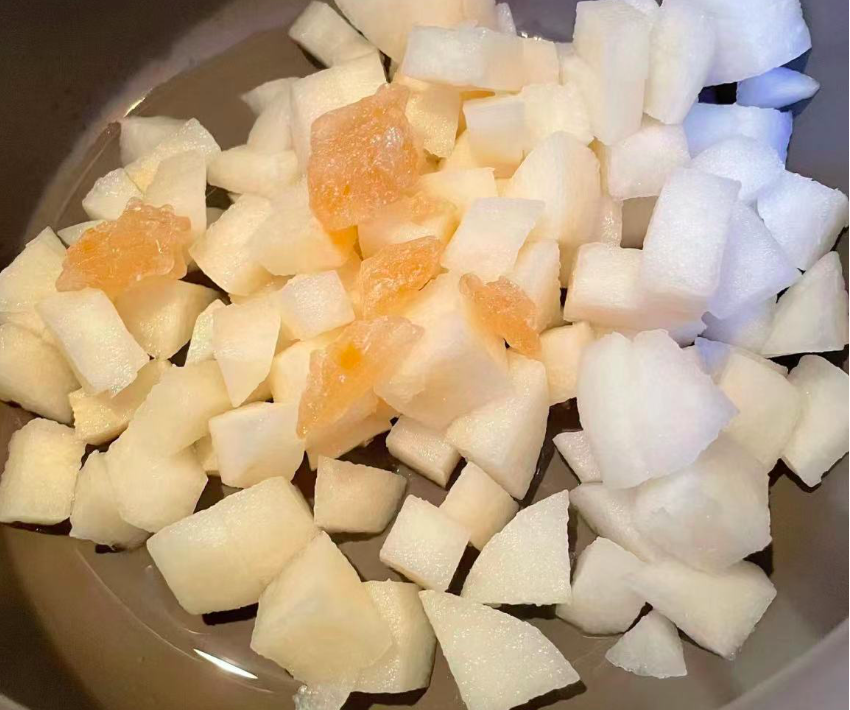 3、把准备好的梨和黄冰糖一齐放入砂锅里。