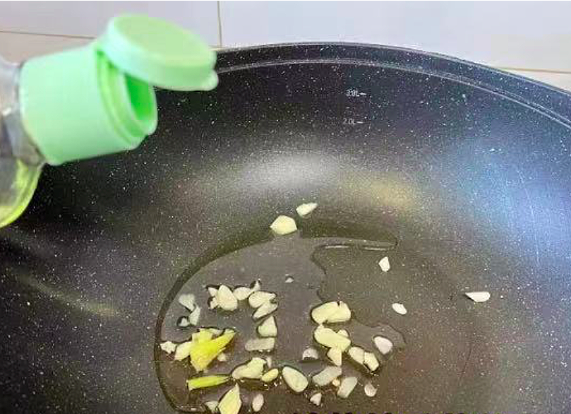 3、热锅凉油,下入蒜末煸炒出香味来。