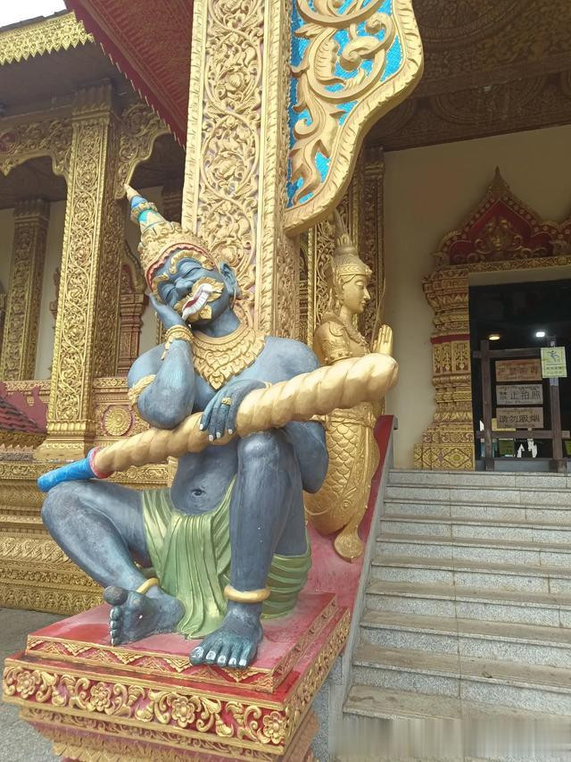 勐泐大梵刹的金刚雕刻,和朔方汉传释教的金刚都不相通,是短衣短裤的小打扮,金刚亦然怕热的。不外耀武扬威倒是无不同。佛菩萨慈眉顺眼,金刚瞋目作念凶恶状,可见世界不雅的区分。原本芸芸众生,善恶都存。在莫得法律拘谨的情况下,约略向隅而泣之时。东说念主性恶才是开阔场地。套用一段禅宗的心灵鸡汤:世上莫得委曲,只须因果。起心动念都是因,当下所受都是果。放下怨、憎、恨,一切随缘,随缘浮松。