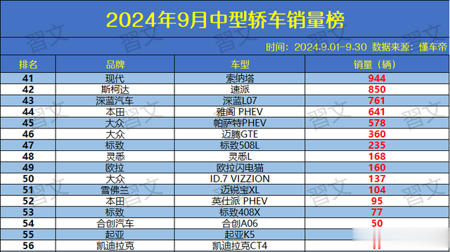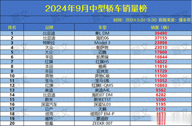 1-20名榜单:率先是秦L DM再次捍卫了销冠位置,9月销量39490辆,迫临4万辆大关,敬佩在接下来的几个月时刻内其销冠位置是不会有太大变化。海豹06月销量37155辆,与秦L DM邻近。特斯拉Model 3迎头大进,销量名次比拟上月有了前进别称的变化。各人帕萨特、迈腾销量推崇高超。日系品牌中凯好意思瑞依旧占据头部地位,雅阁、亚洲龙、天籁等车型在死后追逐。BBA等豪华品牌中型轿车的销量推崇趋于沉静。红旗H5销量推崇优秀,9月销量为14022辆。福特蒙迪欧销量4666辆。