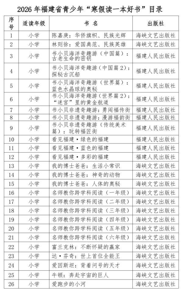 东南网12月5日讯(本网记者 谭佩)书香浸润时光,阅读点亮改日。2026年福建省青少年“寒假读一册好书”看成行将运转。近日,福建省全民阅读促进会组织群众编制并发布了《2026年福建省青少年“寒假读一册好书”目次》,共采用优秀典籍57种,其中包括小学阶段保举典籍44种,中学阶段13种。