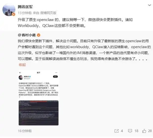3月24日,客村小蒋发文复兴网友对于“目测微信官方龙虾插件只存活了一个周末”:“咱们很快会更新下插件,处罚这个问题。现在唯有升级了最新版的原生openclaw的用户会暂时碰到这个问题,其他比如workbuddy、QClaw接入的没啥影响,openclaw的此次升级,似乎也影响了一堆国表里的IM音信渠谈,一个新址品的迭代里有点小问题,不错走漏。至于后头解读说微信不懂生态玩法,我以为有点像说鱼不会拍浮了。”随后,腾讯张军也复兴谈:“升级了原生openclaw的,提议稍等一下,微信很快会更新插件。诸如Workbuddy、QClaw这些王人不会受影响。”