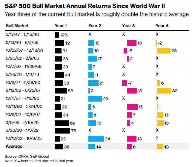 自二战以来,好意思国共有13轮牛市,其中7轮赓续到了第四年,平均累计涨幅为88%。而面前这轮牛市仅用三年本领便险些实现了这一水平,使得标普500的畴昔市盈率达到25倍——这是历次牛市第三年中的最高水平。CFRA首席投资策略师、华尔街资深东谈主士Sam Stovall暗意:“我从未见过这么的情况。”